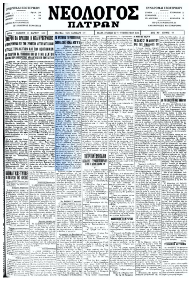 Η είδηση δημοσιεύθηκε στην εφημερίδα «ΝΕΟΛΟΓΟΣ ΠΑΤΡΩΝ», στις 14/03/1936…