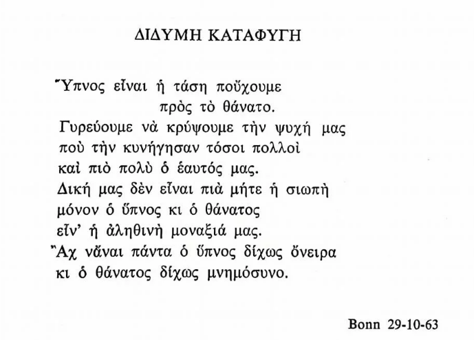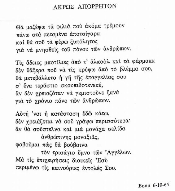 Ένας βαθιά ερωτικός ποιητής που διαχέεται παντού και διαπερνά τα έμψυχα και τα άψυχα αυτού του κόσμου και συνθέτει ποιήματα μοναδικά, για τα πάντα. Γιατί στην ψυχή του ιερωμένου ποιητή δεν φαίνεται να υπάρχουν μικρά και μεγάλα, σημαντικά και ασήμαντα. Μέσα στον δικό του κόσμο, κόσμος το κάθε πράγμα…