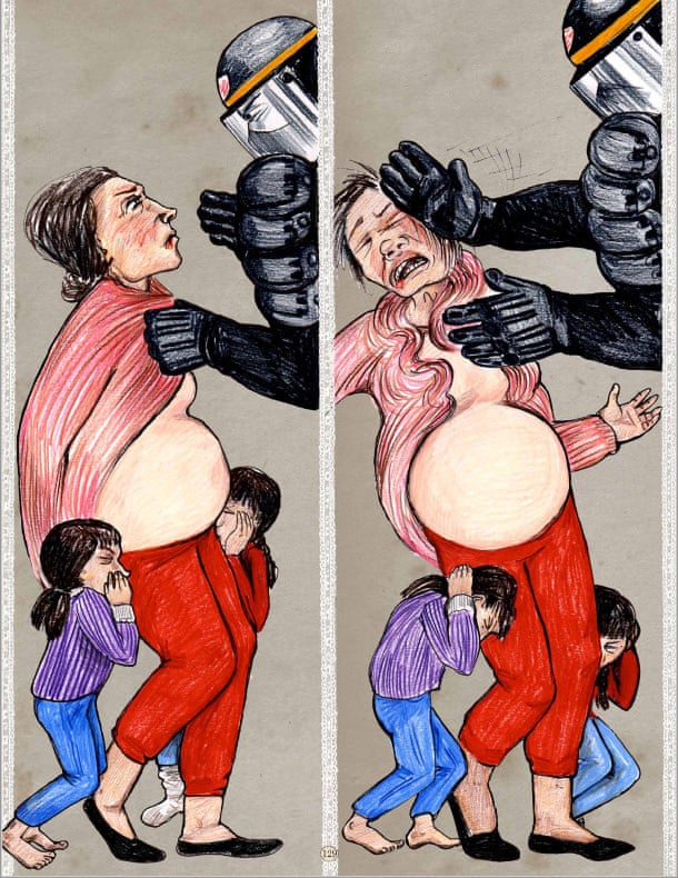 Kate met a young, pregnant mother in Dunkirk who had travelled from Iraq. She later heard that the woman had been assaulted by French authorities and had her belongings destroyed. In the far-left image, Kate has depicted the woman’s courage and defiance as she looks into the eyes of her assailant.