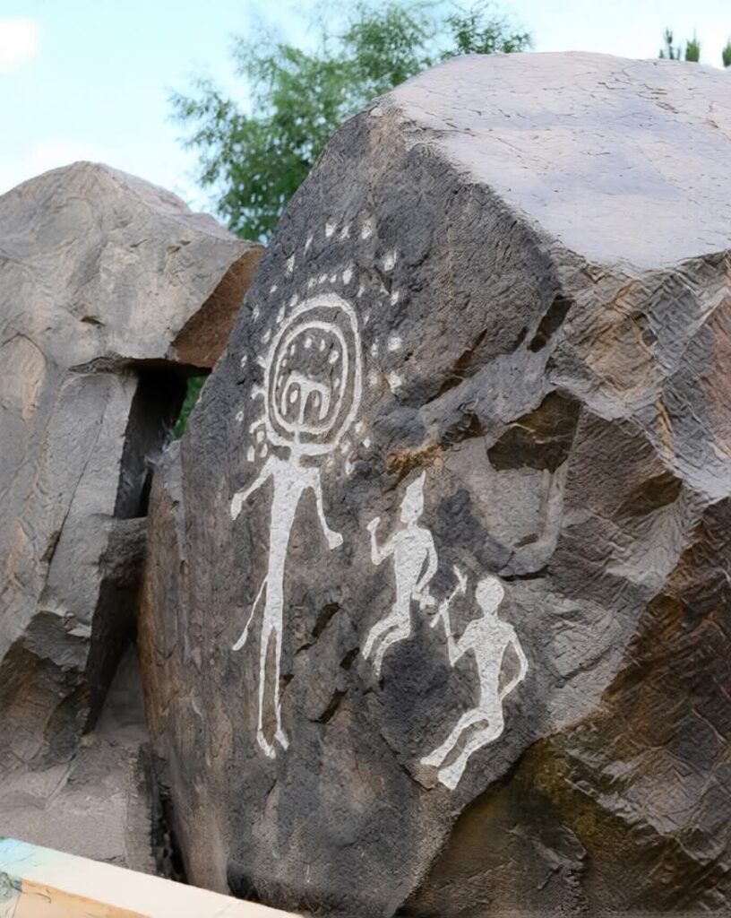 The remarkable Tamgaly Petroglyphs, located along the Ili River in Kazakhstan, preserve more than 5,000 ancient rock engravings created across the Bronze Age, among which the striking figure known as the “Sun-Headed Deity,” dated to roughly 3,400 years ago, stands out as one of the most iconic images, offering a powerful glimpse into the ritual life, cosmology, and spiritual traditions of early societies in Central Asia at this UNESCO World Heritage Site..
